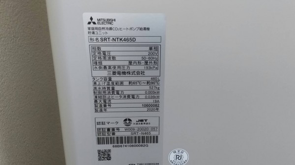 神栖市三菱電機家庭用自然冷媒CO2ヒートポンプ給湯機SRT-NTK465D
